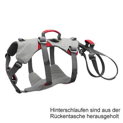 Der Clou: Das "Doubleback Harness"-Geschirr hat hinten auf dem Rücken eine kleine Tasche, darin sind Extra-Riemen verstaut. Diese zur Sicherheit bereits fest angenähten Schlaufen können so um die Hinterläufe des Hundes gelegt werden, dass der Hund problemlos getragen und auch abgeseilt werden kann. Mit den zusätzlichen Hinterschlaufen (Beinschlaufen) wird der Hund an vier Punkten zugleich gestützt - sehr rückenfreundlich!